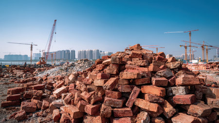 Pile of Red Bricks on Construction Site Under Clear Blue Sky with Cranes and Urban Skyline in Background Showing Development and Urbanization