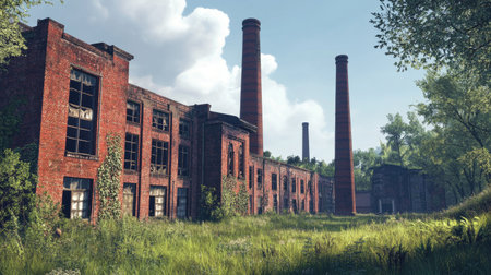 A vintage red-brick factory with tall chimneys, surrounded by overgrown grass.