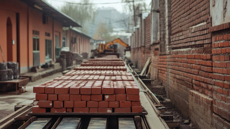 A detailed view of an industrial brick stacking process showcases bricks arranged neatly in a production facility during sunset, highlighting the mood and environment.