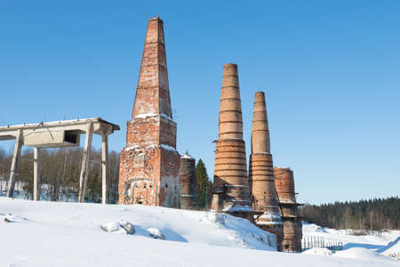View of the ruins of the old abandoned marble and lime factory on a sunny March day. Ruskeala, Karelia