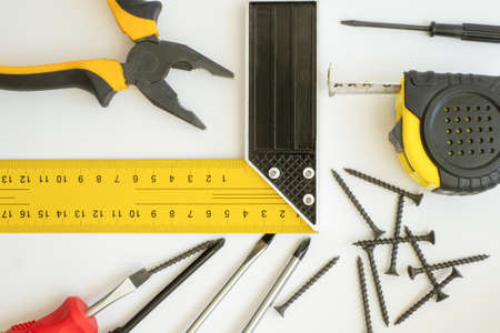measuring tape pliers pencil screwdrivers and a board on the carpenter's workbench. High quality photo