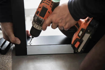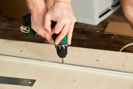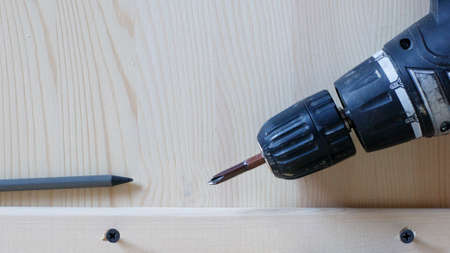 Electric power screwdriver. Carpenter working with hand tool on plywood. Close-up side view. Fixing the metal plank. Copy space. Labor day. Battery instrument. Operating rules and safety precautions.