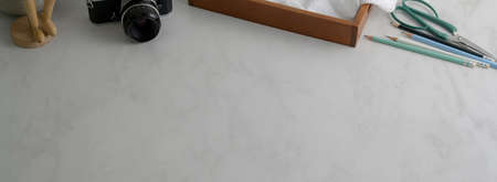 Cropped shot of simple worktable with camera, supplies and copy space on marble desk