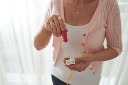 Repair concept. Female hand holds a screwdriver and a hammer on blue studio background.