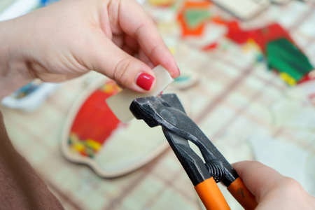 The artist cuts glass and maker mosaic in a wooden harvesting. Female hands closeup collect mosaic of colored stones. Human activity to workplace