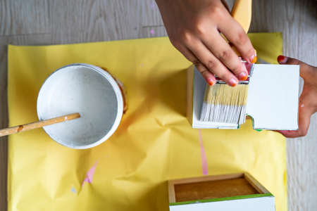 Hand is brushing wooden box with white paint. Upcycle, recycle and home makeover project. Top view.