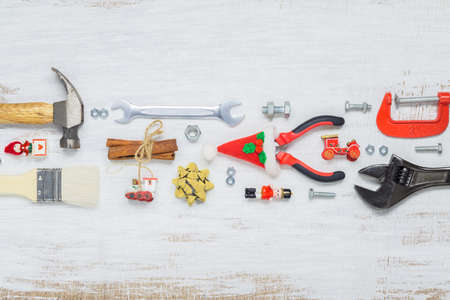 Merry Christmas and Happy New Years Handy Constrcution Tools background concept. Handy House Fix DIY handy tools with Christmas ornament decoration on a grunge white wooden table.