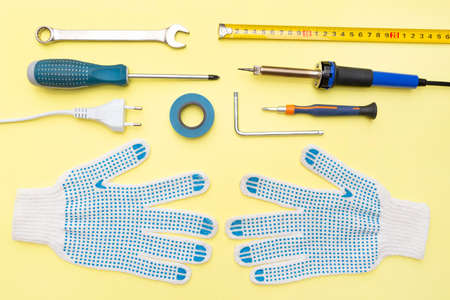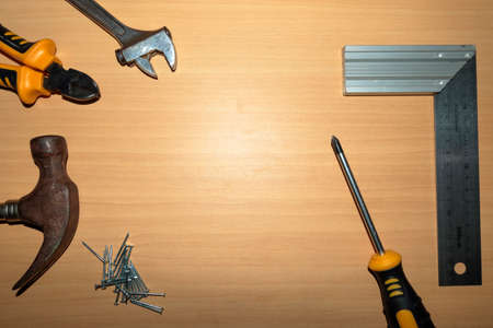 Men's work. The repair tools are on the table. The concept of housework, workshop. Close-up.