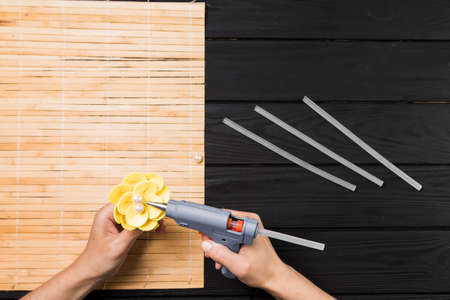 Woman glues glue gun. Woman doing craft jewelry. Women's handicrafts. The concept of creativity.