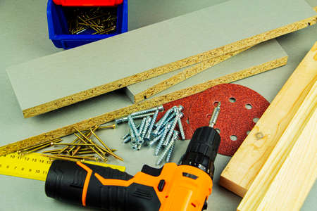 furniture assembly tools, screws, chipboard, screwdriver, ruler, sandpaper.