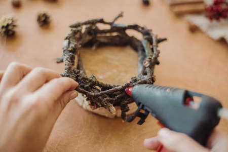 Making rustic christmas candle holder. Hands holding glue gun and making rustic festive decoration from branches, pine cones and cotton on wooden table. Holiday workshop