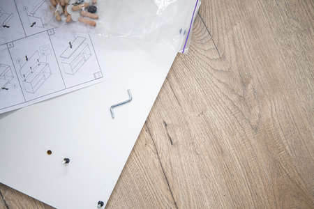 Furniture assembly, furniture assembly instructions on a wooden background. top view, flat lay