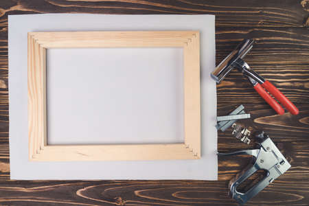 Photo on synthetic canvas in roll, canvas stretcher, stapler and stretching tool on brown wooden background