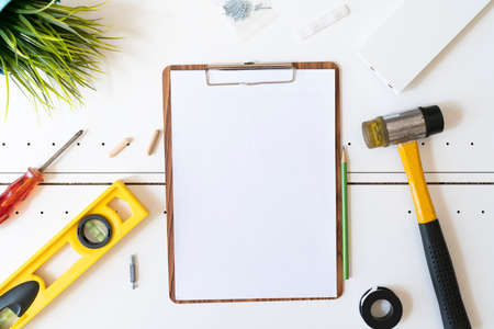 Diy equipment with empty white clipboard on the table, diy and repair home concept