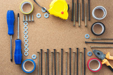 House shape made from screws with essential hand tools and fasteners arranged on a concrete background. Household maintenance and repair diagram.