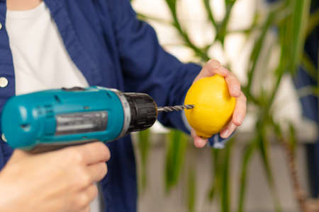 Female hands in a blue shirt hold a screwdriver with a drill and a bright lemon against the background of a light window and green leaves of a houseplant. Selective focus. Concept photo