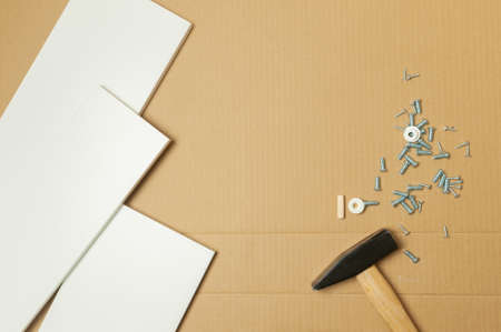 mechanic assembled the furniture in the house according to the manual, along with the mechanic equipment. By hammering the nails Measuring with a tape measure