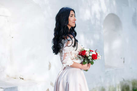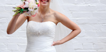Charming smiling bride with bouquet of fresh flowers