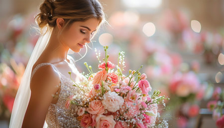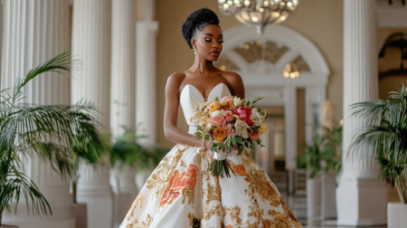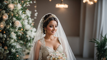 Captivating portrait of an elegant bride in a luxurious wedding venue, holding a stunning bouquet of flowers, embodying beauty and romance.