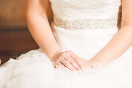Hands of the bride close-up on the background of the wedding dress. High quality photo