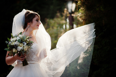 Young bride posing with veil outdoors in the park on her wedding day.