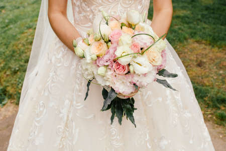 Bridal bouquet with pink and cream roses in the hands of the bride. Wedding concept.