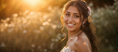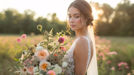 Beautiful bride with soft features looking over shoulder in natural lighting at outdoor wedding venue near sunset Generative AI