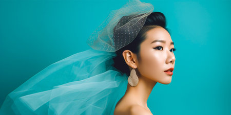 Elegant Asian woman in tulle against a pale blue wall Horizontal portrait shot Enhances the beauty and grace of the subject Pale blue wall forms a softness of the composition