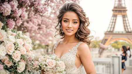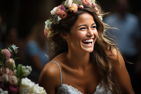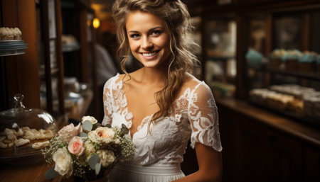A beautiful woman holding a bouquet, smiling with confidence generated by artificial intelligence