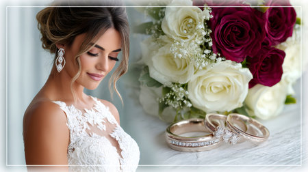 Beautiful bride preparing for wedding day, showing bridal bouquet and rings