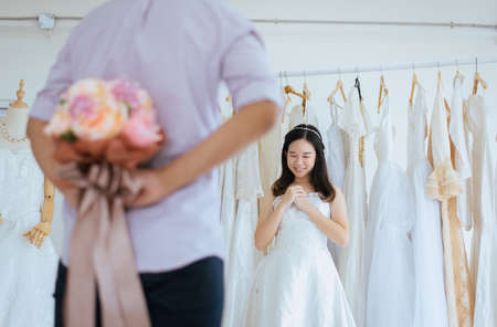 Bride holding a bouquet on hand for wedding,Beautiful asian woman smiling and happy,Romantic and sweet moment