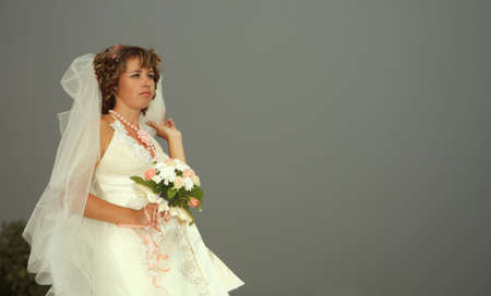 Beautiful young bride in wedding dress with veil. Studio shot.