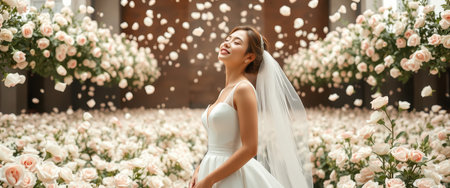 A smiling bride in a white gown and veil stands among a field of white roses as rose petals fall around her.
