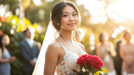 A bride holding a vibrant red rose while walking down the aisle, with her elegant gown flowing gracefully in the soft sunlight.