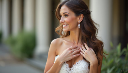 A stunning bride with flowing brown hair and delicate earrings smiles warmly, exuding happiness and grace. Her intricate lace gown highlights her beauty, while the soft background of greenery adds a romantic touch to this enchanting moment.
