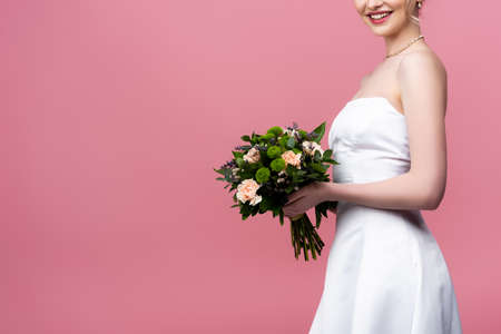 cropped view of happy bride in white wedding dress holding flowers isolated on pink