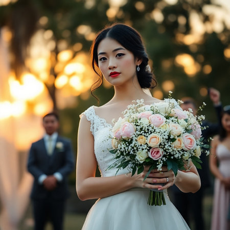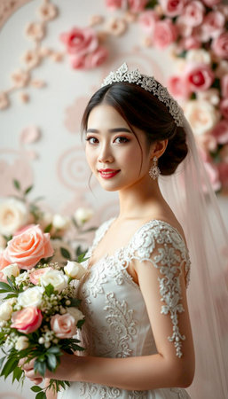beautiful asian bride with a bouquet of flowers in her hands