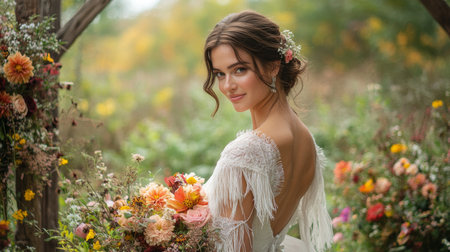 Bride in elegant dress holding colorful bouquet surrounded by flowers in a natural setting during daytime Generative AI