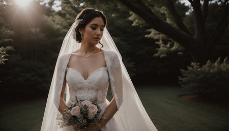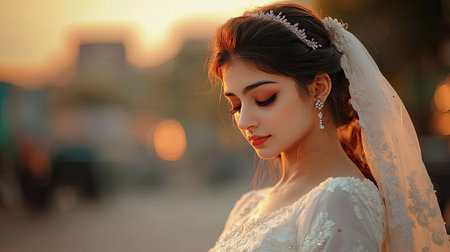 A stunning bride adorned in a delicate veil, captured in soft sunset light. Her serene expression and elegant attire create a romantic atmosphere filled with beauty and grace.