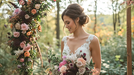 elegant bride before wedding arch in summer day.