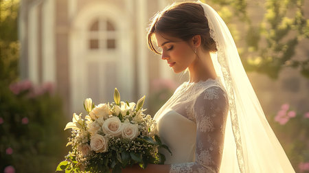 A bride standing in front of a chapel, holding a bouquet of roses and lilies, with her veil softly flowing in the breeze.