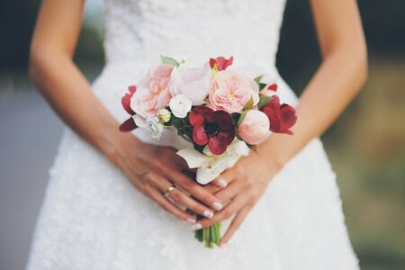 bride holding wedding flower bouquet outdoors. romantic background