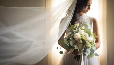 a bride in a white wedding dress, captured in a close-up image, with a delicate bouquet of flowers, standing by the window on her special day