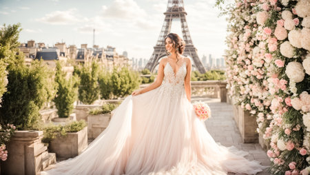 fashion outdoor photo of beautiful sensual woman with blond hair in elegant wedding dress and accessories posing near Eiffel tower