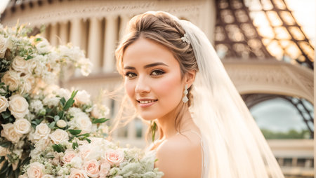 Bridal beauty, woman in wedding attire holding bouquet of flowers.