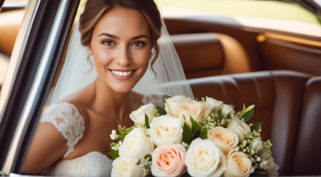A bride is sitting in a car with a bouquet of flowers. She is smiling and looking at the camera