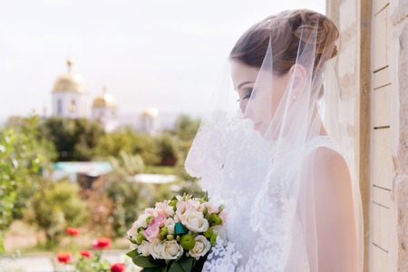 A beautiful bride on a wedding day with a bouquet in hand against the background of an Orthodox Christian church.