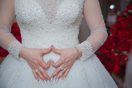 Bride holding on to belly hands in heart-shaped . The bride holds a heart in her hand over her belly . bride in a lovely white dress hugging her belly in the shape of a heart.