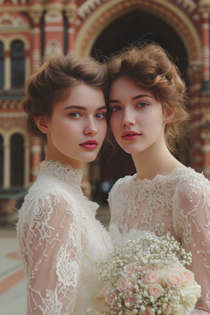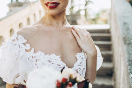 Wedding portrait of a bride, holding red and white flowers in hand. Close up, red lips, no face seen.