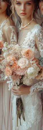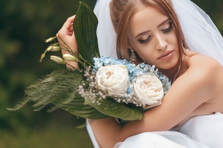 Wedding fashion bride with bouquet in hands. Portrait of beauty bride in white dress.